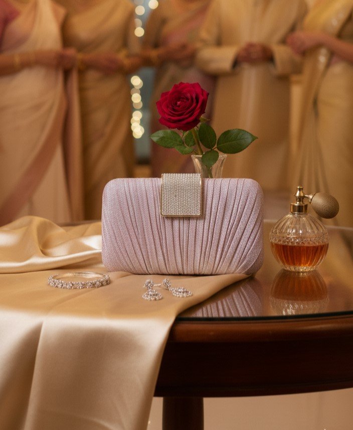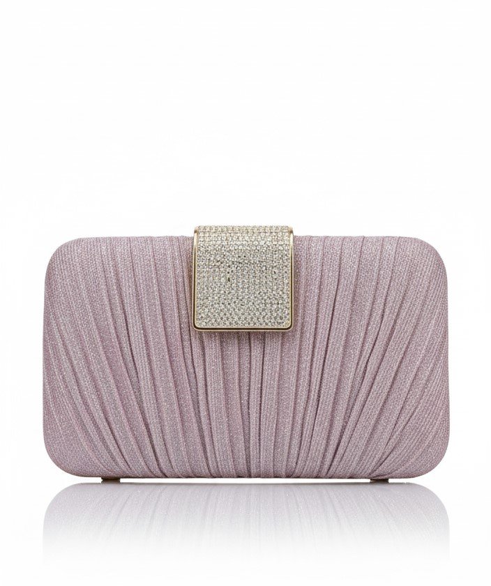 Sophisticated Shimmer Make a radiant statement with the [Product Name]. Crafted from a premium shimmering fabric, this clutch features a delicate sunburst pleated design that creates a beautiful play of light. The soft blush hue offers a versatile, romantic aesthetic that transitions perfectly from traditional wedding attire to modern evening gowns.