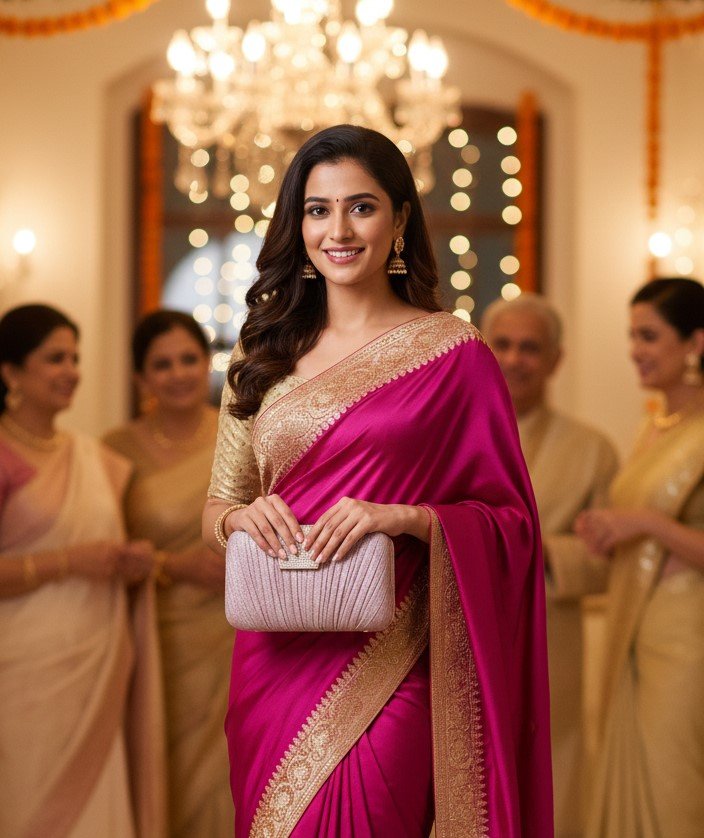 Versatile Elegance Whether paired with a vibrant pink Banarasi saree (as seen in our campaign) or a classic ivory cocktail dress, this clutch adds a touch of refined glamour. It is thoughtfully sized to hold your smartphone, lipstick, and other small evening essentials, ensuring you remain effortlessly elegant.
