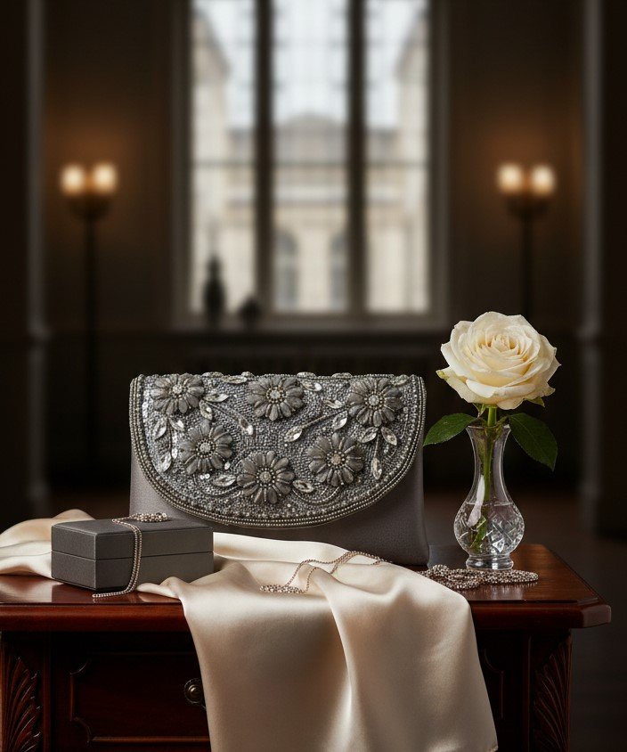 Your Perfect Plus-One The neutral slate gray tone offers incredible styling flexibility. As seen in our campaign, it provides a sophisticated contrast to deep jewel-toned gowns like emerald green or navy blue. Whether you are attending a high-society ballroom event or an intimate evening celebration, this clutch carries your essentials with unmatched grace.